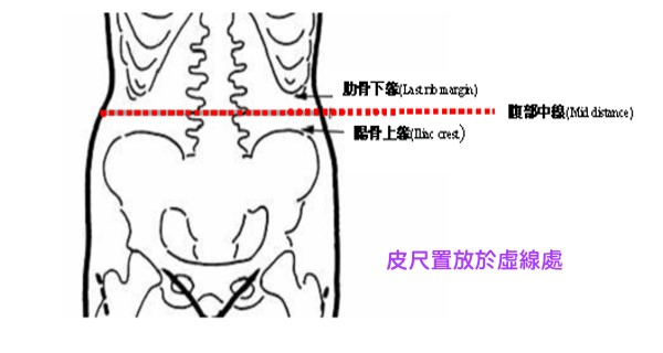 2.以皮尺繞過腰部,調整高度使能通過左右兩側腸骨上緣至肋骨下緣之中間點(如圖),同時注意皮尺與地面保持水平,並緊貼而不擠壓皮膚。